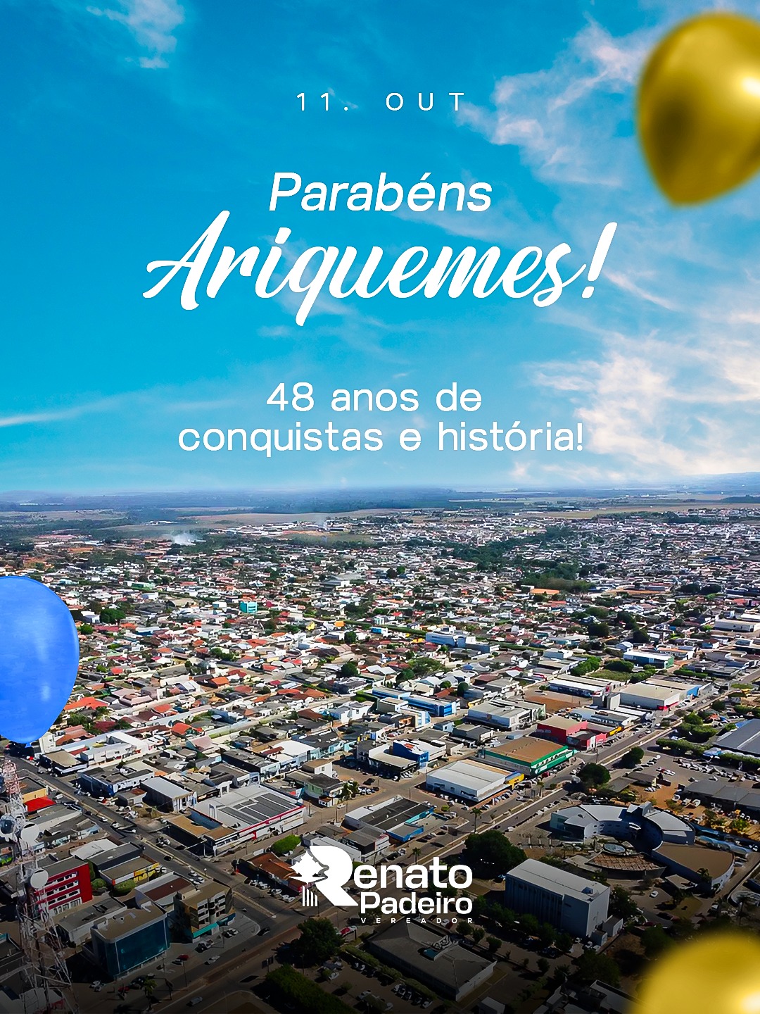 O vereador Renato Padeiro (União) parabenizou o município de Ariquemes pela celebração de seus 48 anos de emancipação política, comemorados neste dia 11 de outubro.