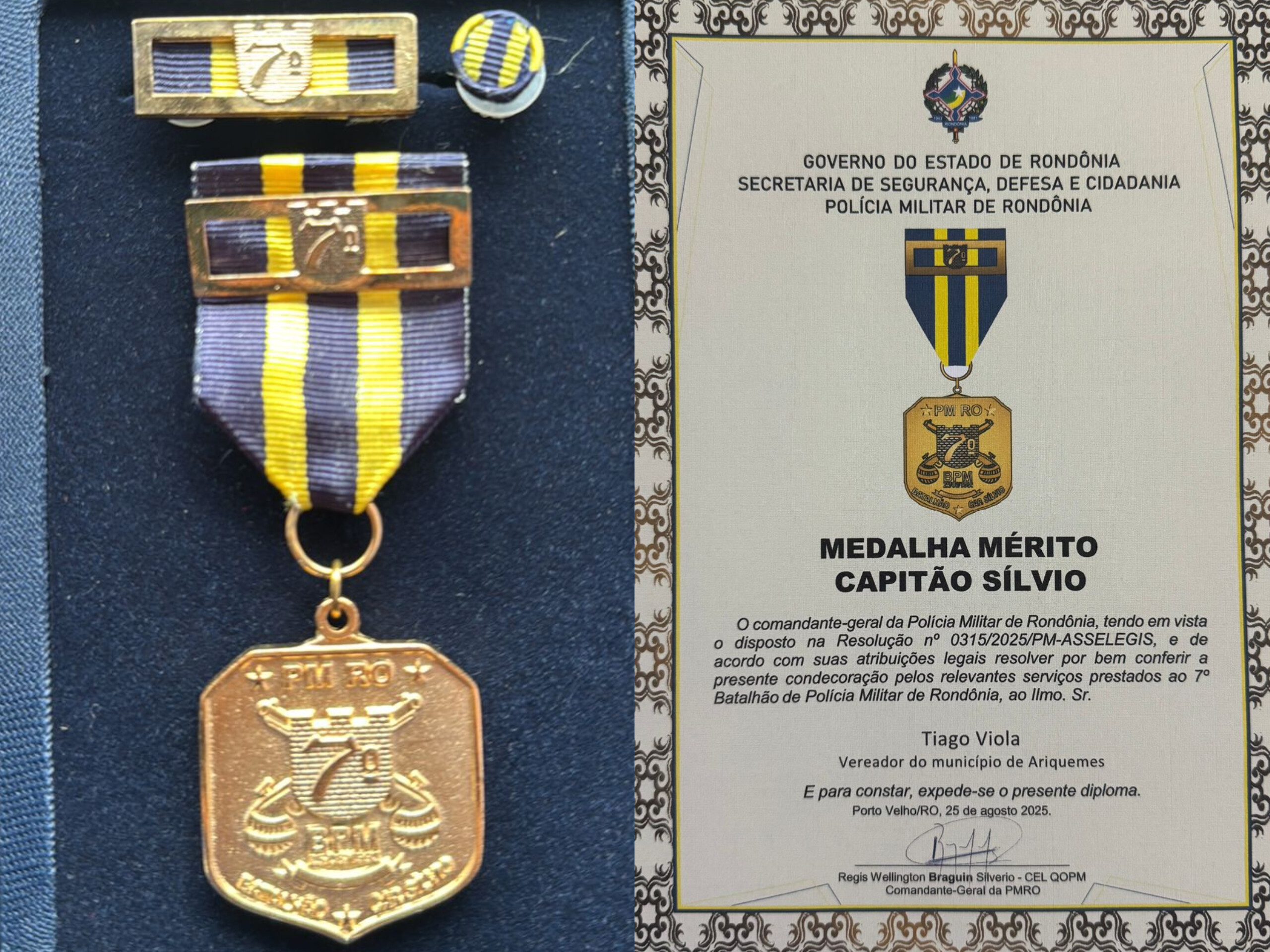 O vereador Tiago Viola (PL) recebeu a Medalha de Mérito Capitão Sílvio, uma das mais altas honrarias concedidas pelo 7º Batalhão da Polícia Militar (BPM) de Ariquemes. A homenagem reconhece a parceria e o apoio do parlamentar às ações em prol da segurança pública no município e em todo o estado de Rondônia.