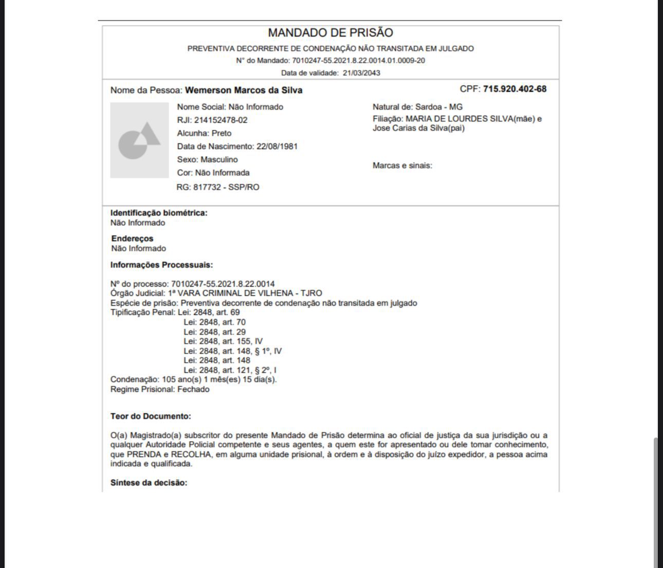 Contra Wemerson Marcos da Silva havia um mandado de prisão expedido pela 1ª Vara Criminal de Vilhena, através do processo nº 7010247-55.2021.8.22.0014.01.0009-20.