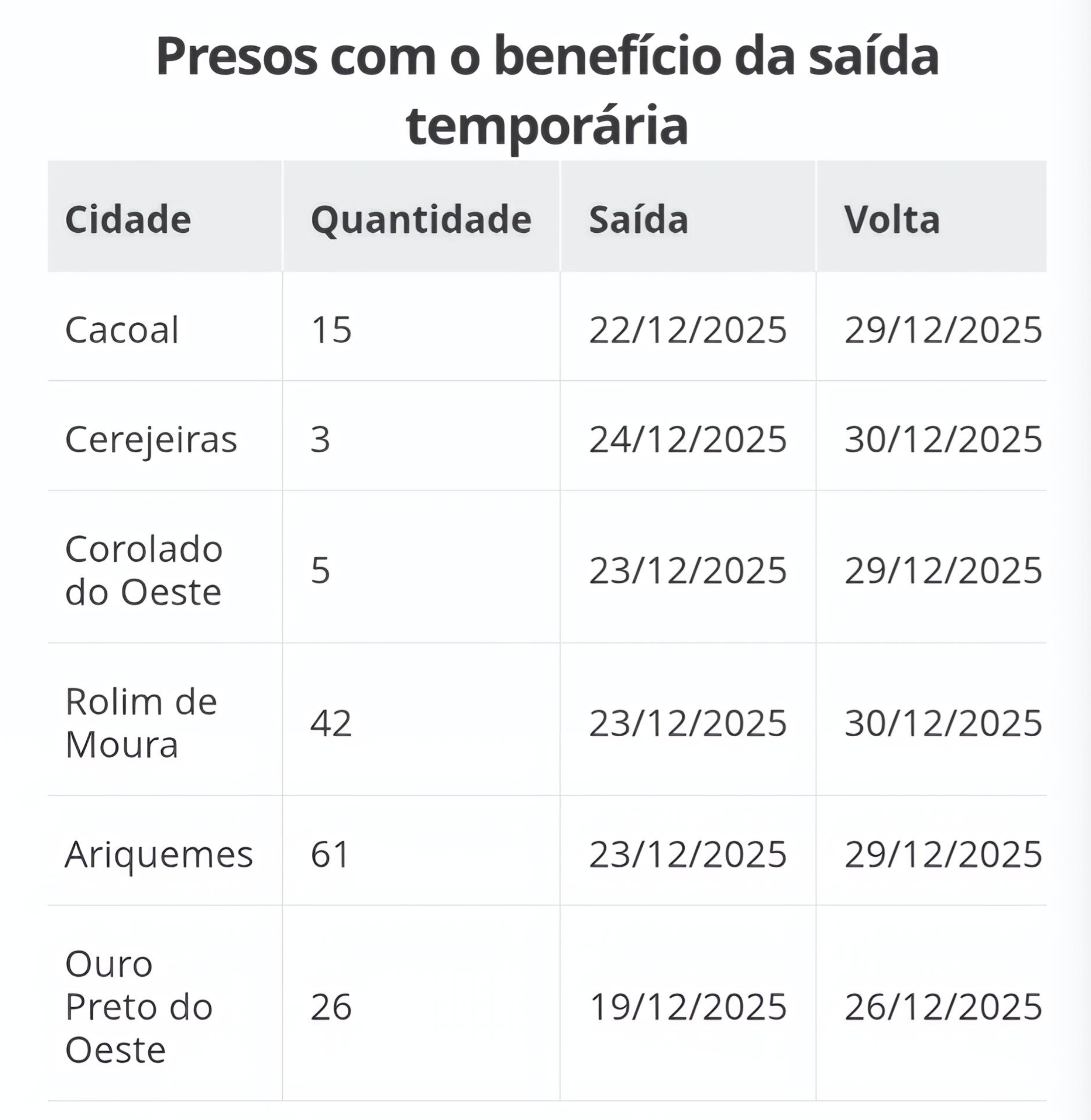 Entre os municípios com maior número de beneficiados estão Ariquemes, Rolim de Moura e Ouro Preto do Oeste. Já a capital, Porto Velho, não teve nenhuma autorização de saída até o momento (veja abaixo).