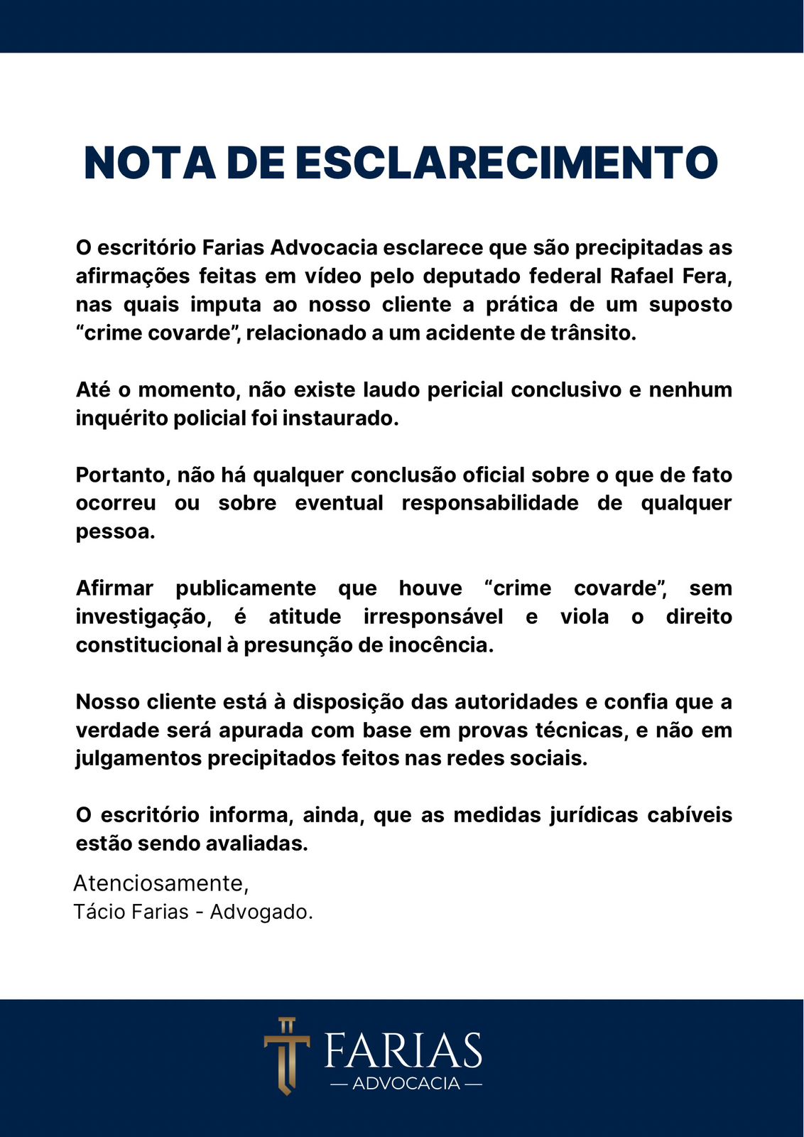 O escritório Farias Advocacia, responsável pela defesa do secretário de obras de Ariquemes, Marcos Venício Araújo Raposo, envolvido em um recente acidente de trânsito na região, emitiu uma nota oficial de esclarecimento em resposta às declarações feitas pelo deputado federal Rafael Fera (Podemos-RO). Em vídeo publicado em suas redes sociais, o parlamentar classificou o episódio como um "crime covarde", afirmação que a defesa classifica como precipitada e violadora de direitos constitucionais.