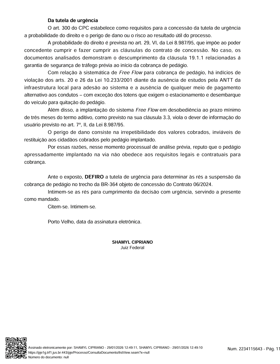 O juiz apontou descumprimento de cláusulas contratuais para o início da cobrança, como a conclusão inadequada dos "Trabalhos Iniciais" em apenas dois meses, apesar de previsão de 12 a 24 meses no Programa de Exploração da Rodovia (PER). Vistorias da ANTT foram amostrais (a cada 10 km, analisando 200m), ignorando metodologia de 100% da extensão com equipamentos como laser e perfilômetro, o que compromete a segurança viária. Além disso, o sistema Free Flow foi implantado sem estudos de impacto social em Rondônia, sem prazo de 3 meses para cadastramento de usuários e exigindo totens para quem não tem internet.