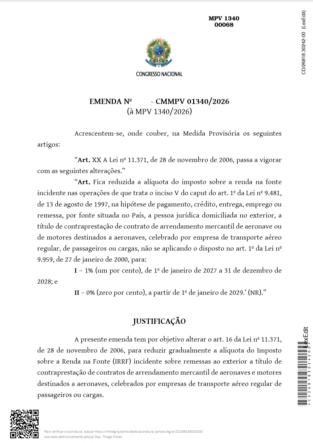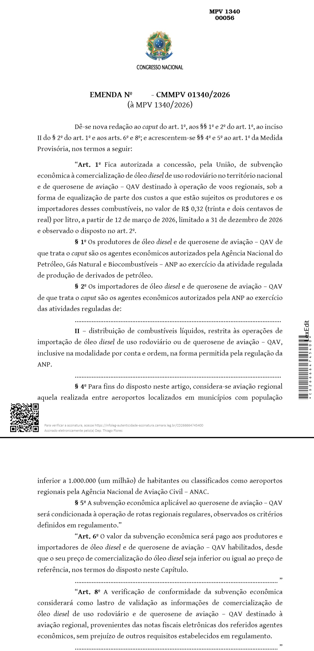Prevendo que o choque do petróleo atingiria os céus com a mesma força que as estradas, Thiago Flores apresentou as emendas nº 56 e 68 para expandir o alcance da MP, que originalmente ignorava o setor aéreo. A emenda nº 56 propõe que o programa de subvenção da União inclua, além do diesel, o querosene de aviação. Esta medida garante um desconto de R$ 0,32 por litro para voos em aeroportos regionais (municípios com menos de 1 milhão de habitantes). O objetivo desta proposta é usar o imposto da exportação de petróleo para impedir que o custo do combustível — que representa 30% das despesas das empresas — seja repassado integralmente ao passageiro. Já a emenda nº 68, foca nos custos fixos das empresas propondo reduzir gradualmente até zerar, em 2029, o Imposto de Renda Retido na Fonte (IRRF) sobre o aluguel (leasing) de aeronaves e motores, dando fôlego financeiro para Azul e Gol manterem suas frotas sem cancelar rotas no interior.