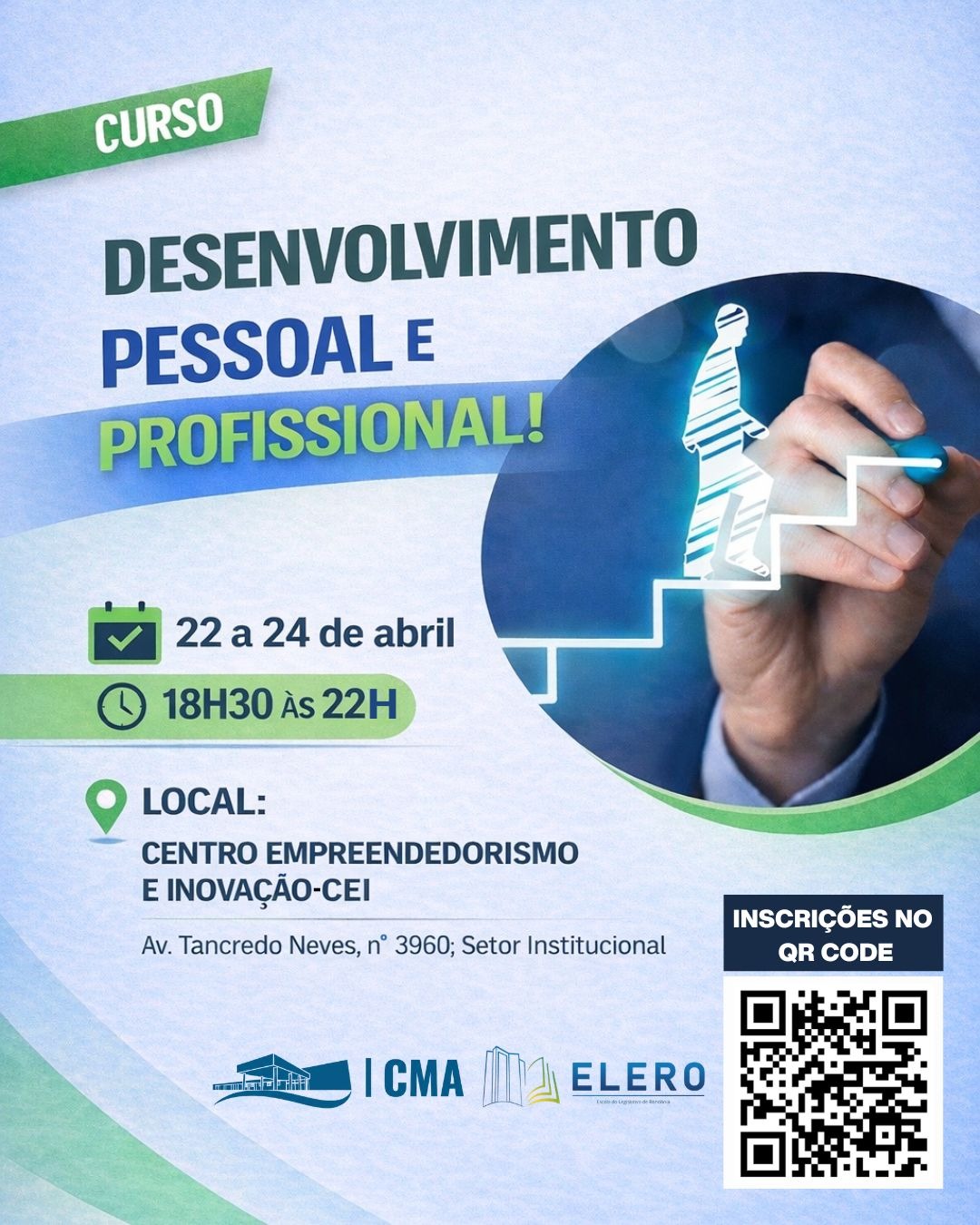 O curso será realizado entre os dias 22 e 24 de abril, sempre das 18h30 às 22h, no Centro de Empreendedorismo e Inovação (CEI). A proposta é oferecer aos participantes ferramentas e conhecimentos que contribuam para o crescimento pessoal e o desenvolvimento da carreira profissional.